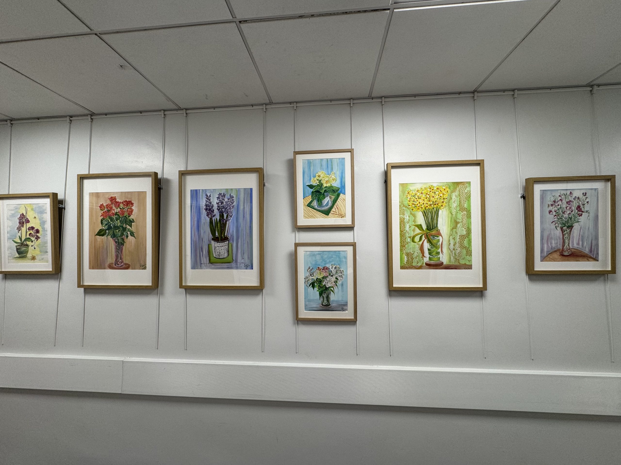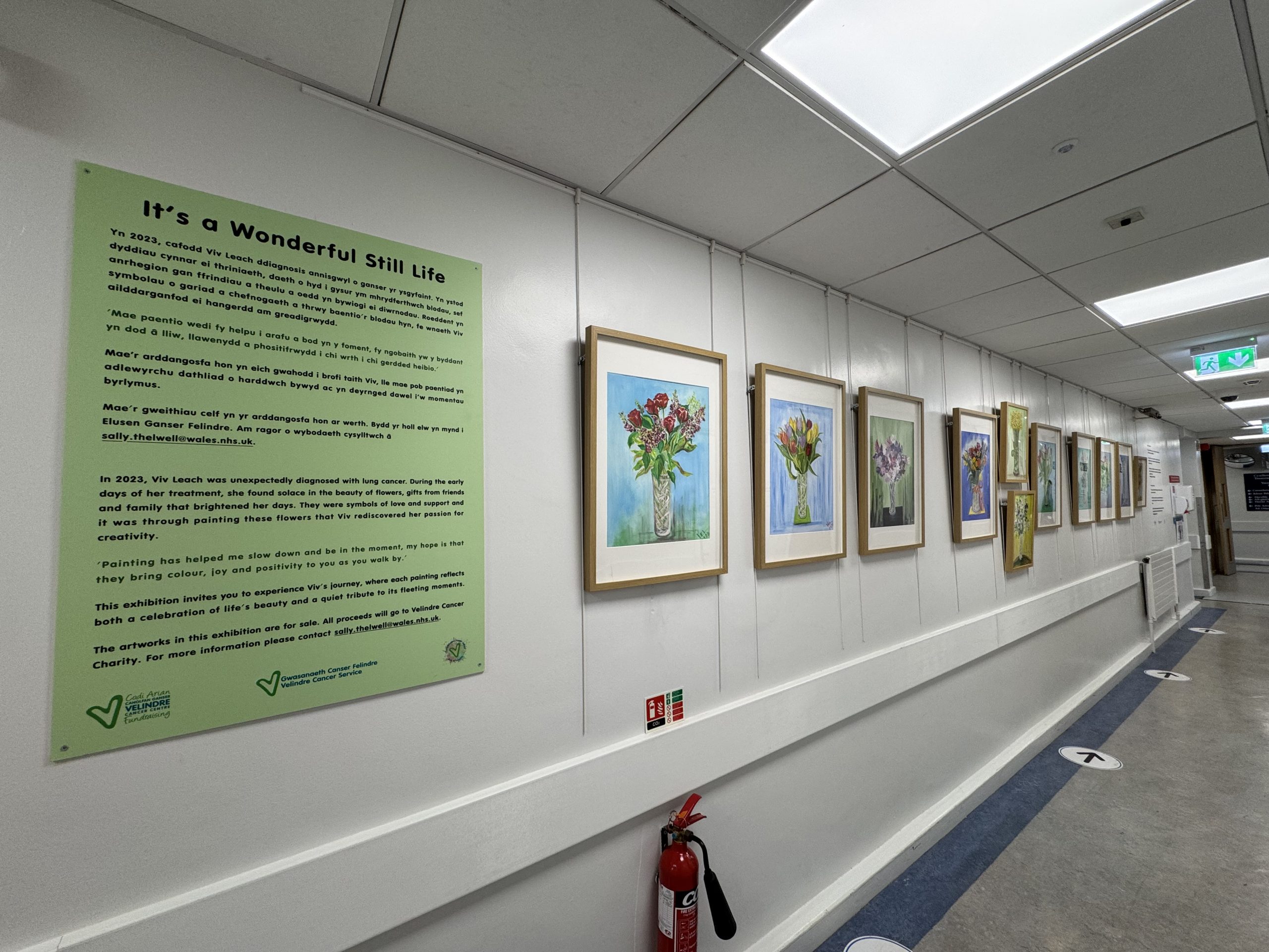 Through a new continually changing community gallery, our own incredible fundraiser and Velindre patient, Viv Leach, has used her creative skills to get involved in the Arts in Health programme. Viv was diagnosed with lung cancer in 2023 and during her treatment found a way to preserve the beautiful bouquets of flowers she received regularly from friends and family. Painting her bouquets led Viv to the Arts in Health programme, which is showcasing her work at the centre. Viv has also run silent auctions to fundraise for Velindre and is even planning on seeking commissions from anyone who’d like a special painting of their own.